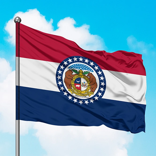 Рік затвердження 1913. Опис прапора: Три горизонтальних смуги — червона, біла та синя. В центрі розташована Печатка Міссурі з синьою окантовкою, на якій розташовано 24 білих зірки. Автором прапору є Мері Елізабет Уоткінс Олівер...