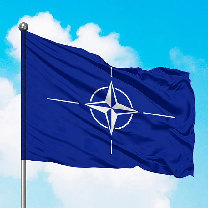 Прапор Організації Північноатлантичного договору (НАТО) складається з прямокутного полотнища синього кольору, в центрі якого зображена біла роза вітрів з білими лініями, які розходяться в чотирьох сторонах світу. Кольори прапора несуть культурні, політичні, і регіональні значення. Синє полотно символізує Атлантичний океан, а коло — єдність серед ..