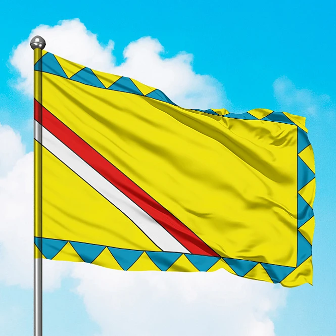 Рік затвердження 1904. Опис прапора: Полотнище прапора розділено на 4 чверті. Перша і четверта чверті складаються з 6 вертикальних планок, почергово золотого і чорного кольору з діагональною стрічкою, на якій ці кольори змінюються на протилежний. Друга і третя чверті сріблясто-червоні. Вони в свою чергу розділені на 4 частини білого і червоног..