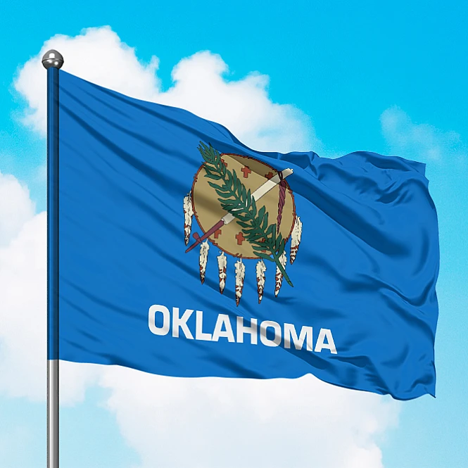 Рік затвердження 1941. Опис прапора: На блакитному полі зображені традиційний щит індіанського племені «оседж», а на ньому перехрещені люлька миру і оливкова гілка. Знизу білим написана назва штату. Перший прапор було затверджено в 1911 році. Тоді це був червоний прапор з білою зіркою, всередині якої було написано «46». В 1924 організація «Дочк..