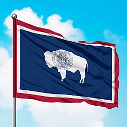 Опис прапора: На синьому поле з червоною ззовні та білою всередині окантовками зображений білий американський бізон з печаткою Вайомінгу на боці.