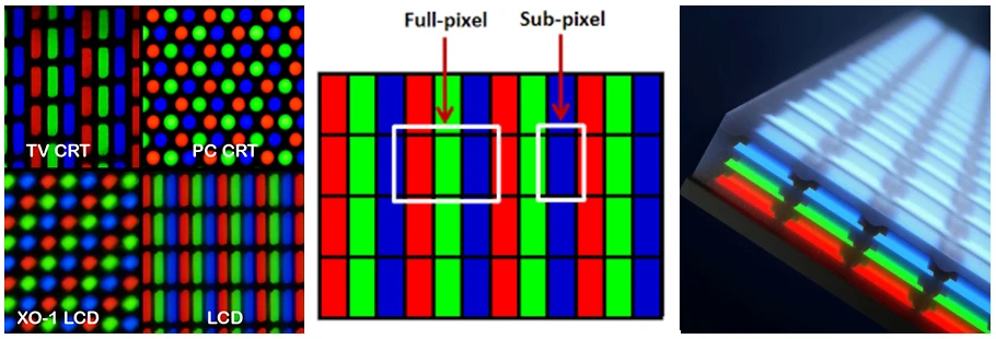 Каждый пиксель на экране монитора состоит из трёх субпикселей — красного, зелёного и синего. При этом они могут иметь разное расположение и форму.