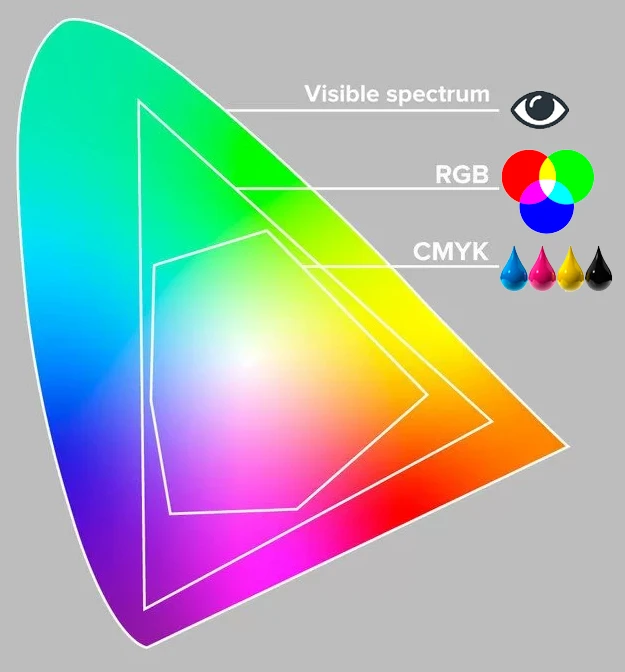 Современный экран способен воспроизвести практически любой цвет. А печатная машина, заряженная голубой, пурпурной, желтой и черной краской – нет. Печатная машина сталкивается с цветами, которые он не может воспроизвести, путем смешивания CMYK. Результат оказывается непредсказуемый, и в результате мы получим не те цвета, что которые видели на экране.