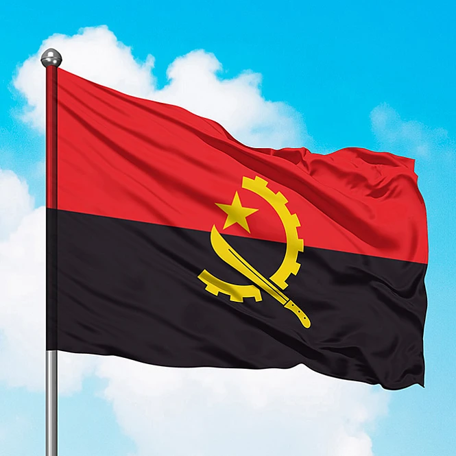 Флаг Анголы – один из официальных символов государства Ангола. Он разделен горизонтально на верхнюю красную половину (символизирует социализм) и нижнюю черную половину (символизирует Африку), и имеет желтую половину зубчатой передачи (символизирует рабочий класс и промышленность), пересекаемую мачете (символизирует крестьянство и вооруженную борьб..