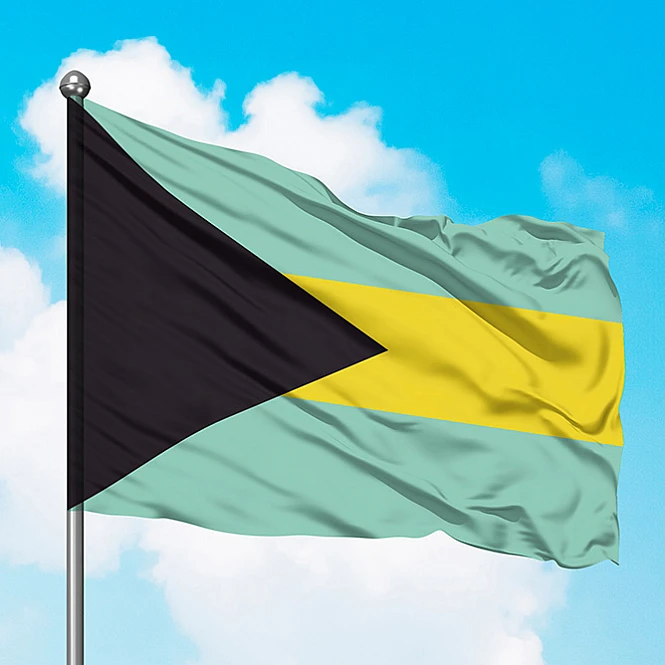 Флаг Багамских островов – один из официальных символов Багамских островов. Официально утвержден 10 июня 1973 года. Черный равнобедренный треугольник символизирует единство и решительность багамцев. Три горизонтальные ленты одинаковой ширины символизируют природные ресурсы острова: две ленты аквамаринового цвета сбоку символизируют море. а золотая..