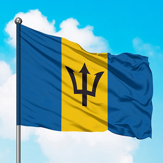Флаг Барбадоса – один из официальных символов Барбадоса. Официально утвержден 30 ноября 1966 года. Флаг состоит из трех одинаковых вертикальных лент (синие ленты по краям, желтая лента в центре). В центр флага вписан трезубец. Синий цвет символизирует море, а желтый – песок. Трезубец трактуется как отражение трех основных принципов Барбадоса: вл..