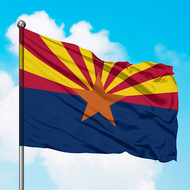 Год утверждения 1917 года. Описание флага: Нижняя половина флага полностью синяя, в верхней изображено 7 красных и 6 желтых лучей, выходящих из центра. Посредине находится оранжевая звезда. Флаг был придуман в 1910 году полковником Чарльзом Харрисом для команды, представлявшей Аризону на национальных соревнованиях по стрелковому спорту...