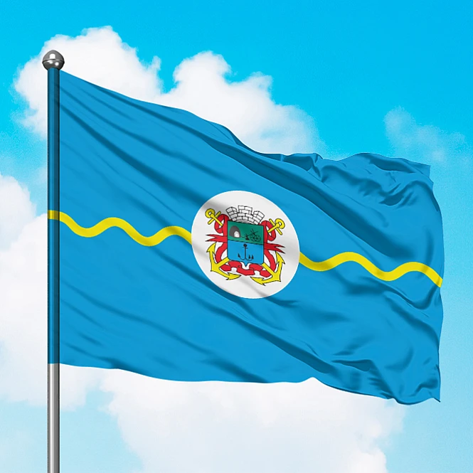Флаг Бердянска. Флаг Бердянска — современное знамя Бердянска Запорожской области, утвержденное 27 июля 1999 года решением №16 VIII сессии городского совета XXIII созыва. Знамя — полотнище синего цвета, с белым кругом. В центре флага находится полный герб города, выполненный в установленной цветовой гамме, и волнистая линия желтого цвета, про..