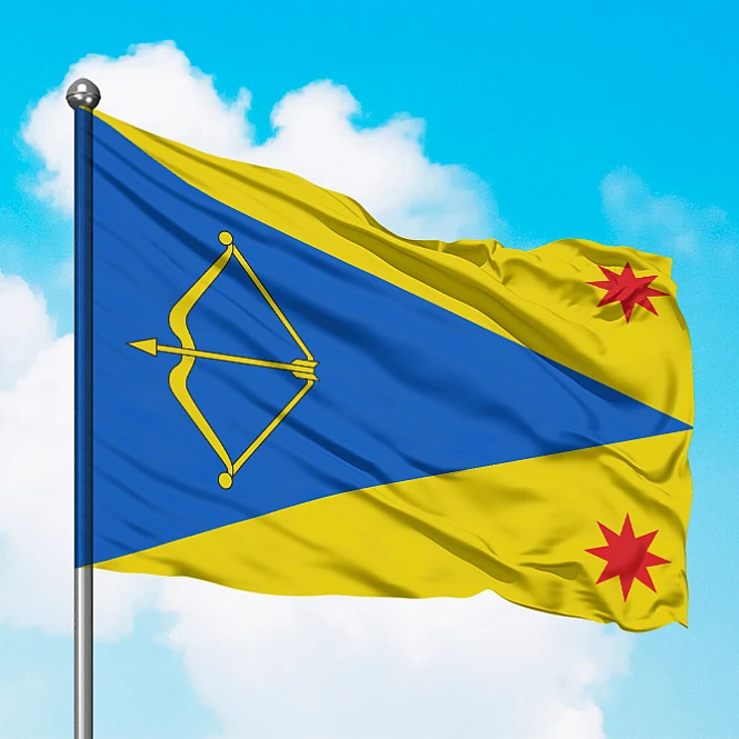 Флаг Барышевки. Флаг Барышевки - официальный символ пгт Барышевки Броварского района Киевской области, утвержден 21 апреля 1998 года. Автор проекта флага – А. Гречило. Флаг Барышевки представляет собой прямоугольное полотнище, от древка до середины свободного края идет синий клин, на котором желтый лук с натянутой стрелой (острием к древку),..