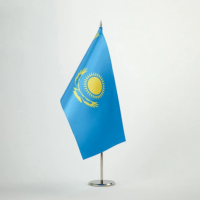 Флаг Казахстана – дата принятия: 4 июня 1992 года. Государственный флаг Казахстана представляет собой прямоугольное полотнище голубого цвета с изображением в его центре солнца с 32 лучами, под которым расположен орел с расправленными крыльями. У древка – вертикальная полоса с национальным орнаментом. Изображение солнца, лучей, орла и орнамента – ..