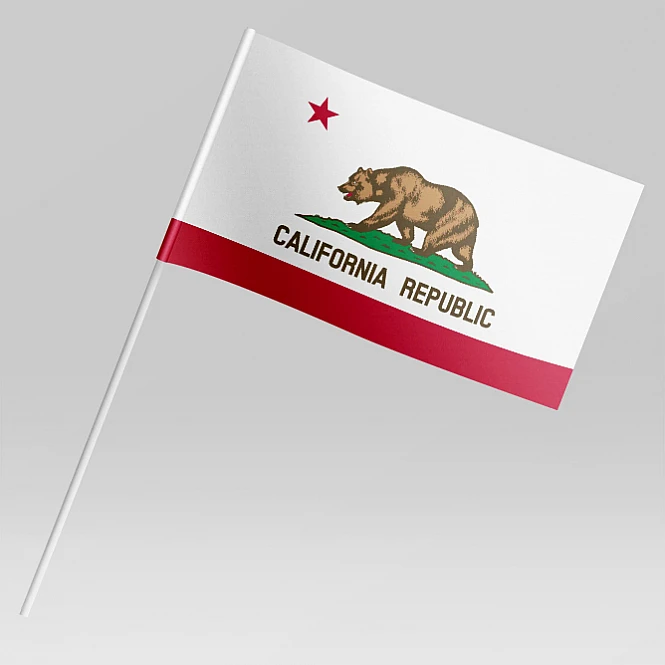 Год утверждения 1911 года. Описание флага: На белом поле красная полоса внизу, в крестце красная звезда. В центре изображен медведь гризли, под ним надпись «California Republic». Происходит из флага Калифорнийской республики...