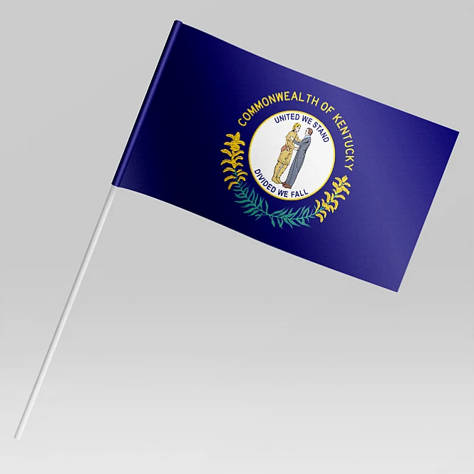 Год утверждения 1928 года. Описание флага: Печать Кентукки на темно-синем поле. Над печатью полукругом желтым написано название штата, а под печатью полукругом два цветка золотушника. Флаг создал Джесси Кокс Бьорджесс – учитель из Франкфурта (Кентукки)...