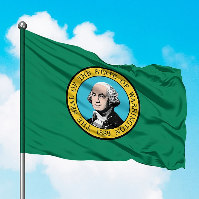Год утверждения 1923 года. Описание флага: В центре темно-зеленого флага размещена печать штата с портретом Джорджа Вашингтона, в честь которого он получил свое название. Придуман в 1914 году организацией «Дочки американской революции»...
