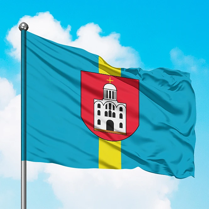 Флаг Вышгородского района Киевской области. Флаг Вышгородского района – официальный символ Вышгородского района Киевской области. Флаг представляет собой прямоугольное полотнище, состоящее из трех вертикальных полос — синей, волнистой белой и пурпурной. В синем (возле древка) поле — желтое изображение древнерусского однокупольного храма...