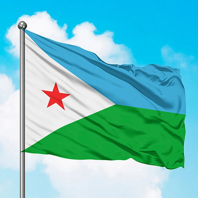Национальный флаг Джибути представляет собой двухцветный горизонтальный флаг с ровными полосами светло-голубого и светло-зеленого цвета, с белым равносторонним треугольником на подъеме. В центре треугольника красная звезда. Флаг сочетает в себе базовый макет и цвета флага Фронта освобождения сомалийского побережья. Светло-голубой цвет символизируе..