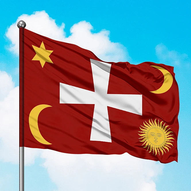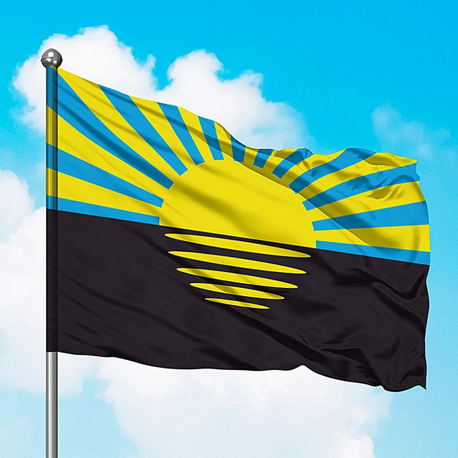 На флаге изображены Крест (символ богочеловека, главный арийский оберег), Заря (шестиугольная Звезда Велеса), Солнце и Луна. Войско Запорожское Низовое — нерегистровое казачество Запорожье второй половины XVI — конца XVIII века с дислокацией за порогами Днепра. Возглавлял войско кошевой атаман, очагом была Запорожская Сечь. Первым кошевым атаманом..