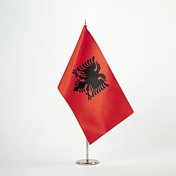 Флаг Албании обычно представляется как изображение тёмного двуглавого сокола на красном полотне. Красный цвет флага обозначает кровь албанских патриотов, пролитая ими в войне против поработителей (турецких).
