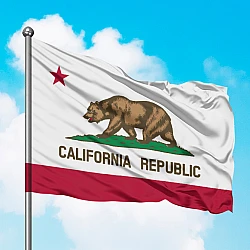 Описание флага: На белом поле красная полоса внизу, в крестце красная звезда. В центре изображен медведь гризли, под ним надпись «California Republic».