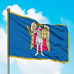 Флаг города Киева представляет собой прямоугольное полотнище синего цвета с изображением в его центральной части фигуры Архангела Михаила, обрамленное золотой полосой с бахромой.
