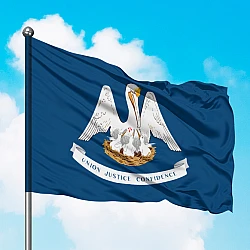 Описание флага: На синем поле расположен пеликан из печати Луизианы. Под ним лента с надписью "Union, Justice and Confidence" (англ. Союз, справедливость и вера - девиз штата).