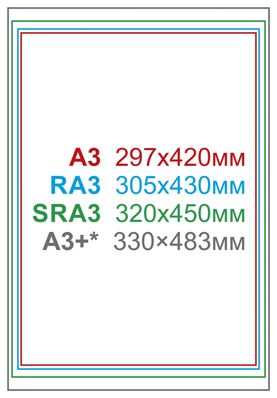 Бумага формата A3+ (A3 nobi/A3 extra/Super A3) не имеет стандартизированного размера. В международный стандарт ISO 216 входит только формат А3, а формат А3+ представляет собой формат А3 увеличенный за счет дополнительных полей. Причем, каждый производитель бумаги и принтеров увеличивает поля на свою величину и получает свой формат А3+. Однако абсолютный максимум формата A3+ встречающийся у производителей — это так называемый, не обрезанный формат А3+ размером 330×483 мм. * Поэтому А3+ можно обозначать все форматы от А3 (297×420 мм) до этого максимума 330×483 мм.